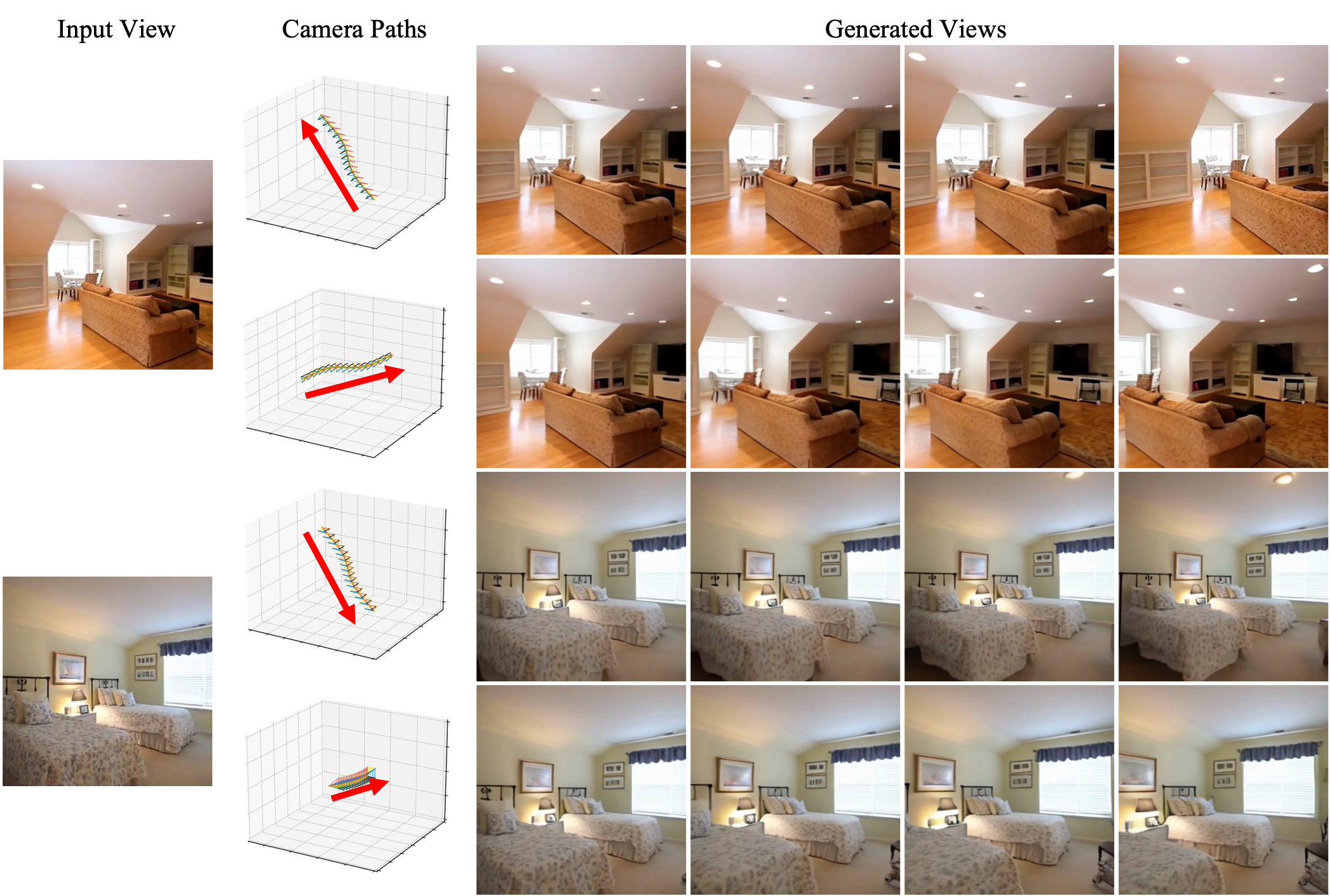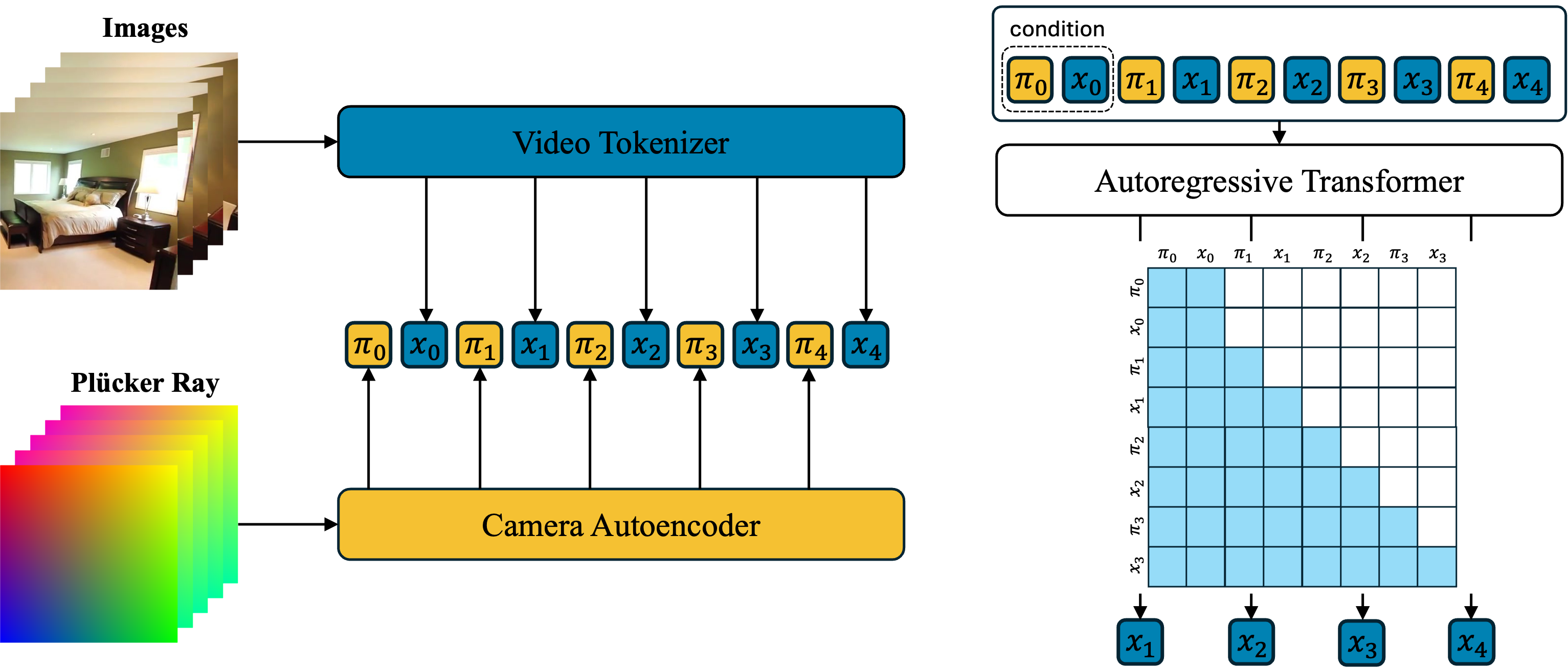 Left: we apply a video tokenizer to convert image sequence into latent codes. We also apply a camera autoencoder to map camera Plücker raymap to latent camera tokens. The camera tokens are inserted before visual tokens as a 3D positional instruction. Right: the interleaved sequence is the input of a decoder-only causal transformer. The tokens of the first view are the condition tokens thus always visible to all the subsequent tokens. We use the ground truth sequence from the tokenization process to supervise the weights of a utoregression model.